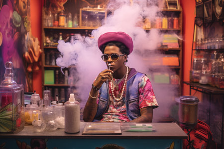 An AI generated illustration of A young adult male wearing sunglasses and a pink jacket is exhaling a plume of smoke from his mouth