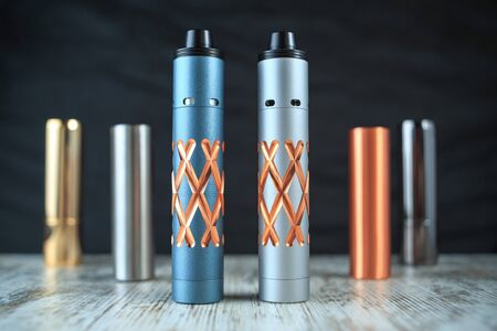 Still life with vape devices on the wooden background.