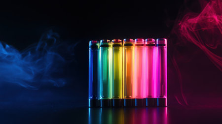 Rainbow colored disposable e cigarettes with smoke on dark background