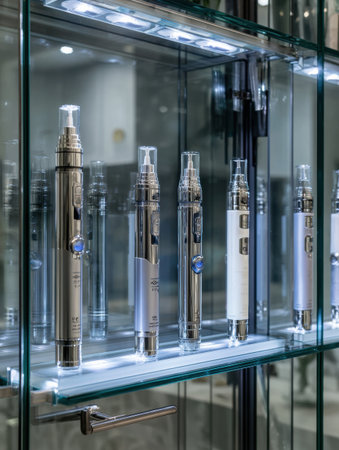 A glass case lit by spotlight displays premium aesthetic tools, revealing a glimpse of a prestigious clinic with an open side.