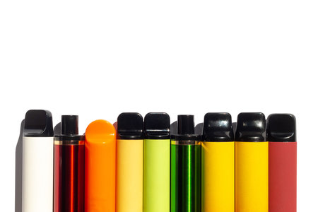 Bright colored sleek vapes aligned in a row isolated on a white background. Concept of e-cigarettes, modern design, vibrant colors, smoking devices. Banner.