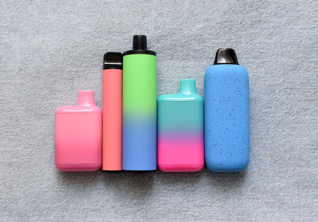 Several multi-colored electronic cigarettes lie on denim. Vape with nicotine.