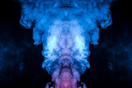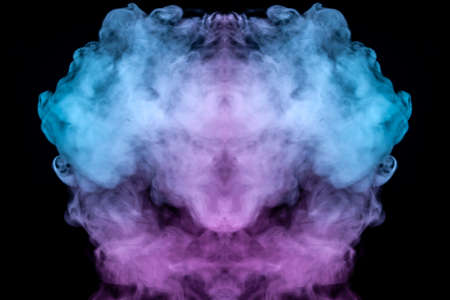 Dense multicolored smoke of blue and pink colors on a black isolated background. Background of smoke vape