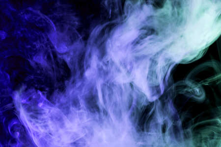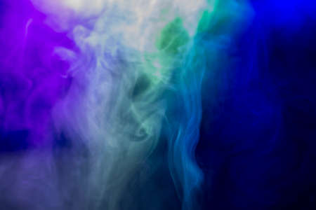 Multicolor, thick smoke, illuminated by colored in blue, purple and pink light against a dark black isolated background, welded with clubs and curls, rising from a steam of vape. Wind blow