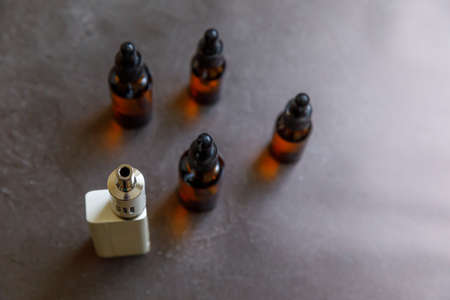A concept with an electronic cigarette. Vape. Bottles with liquid for electronic cigarette. A concept vape.