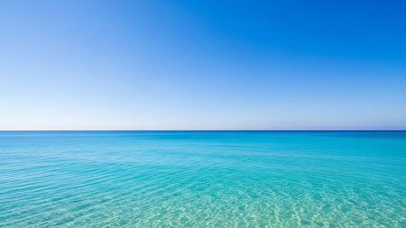 A serene, expansive view of shallow, transparent turquoise ocean water meeting a clear blue sky.