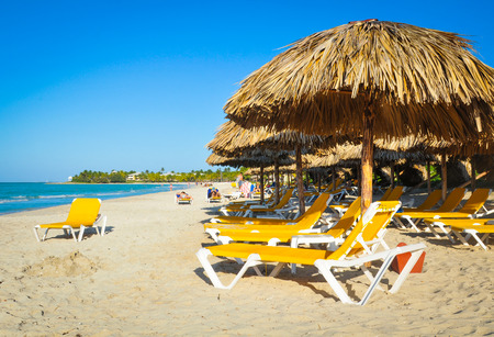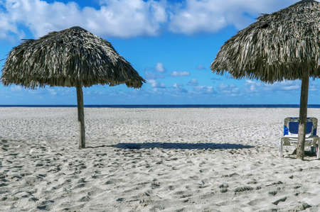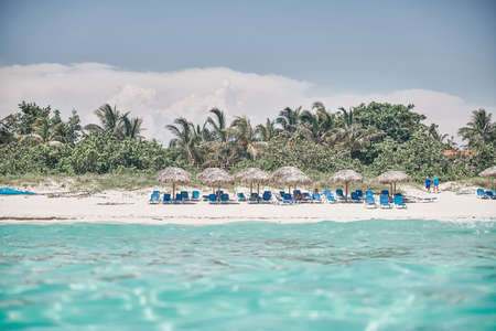 Exotic beach with white sand and umbrellas made of palm leafs in Cayo Largo island