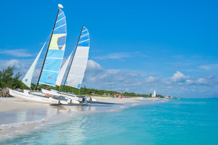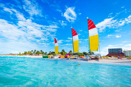 sailing multicolored catamarans is parked on the white sand on the seashore against the backdrop of beautiful tropical nature. tourist attractions in Cuba. summer season