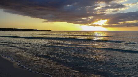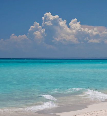 Atlantic sandy beach of Cuba, resort Varadero. Waves and cloudy sky. Scenic seascape