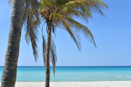 Holguin, Cuba, Playa Esmeralda. Beautiful Caribbean sea turquoise blue color and palm trees on the beach