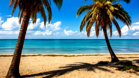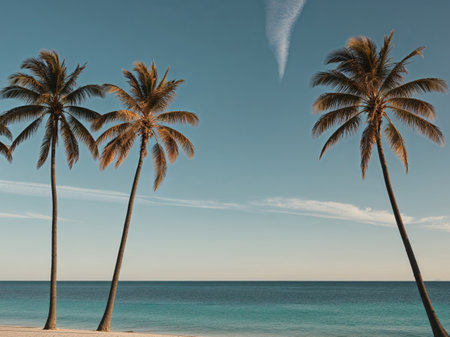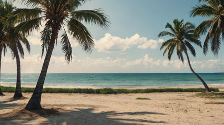 AI Generated. Tranquil beach view with palm trees under a bright sky at midday near the coast