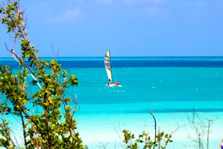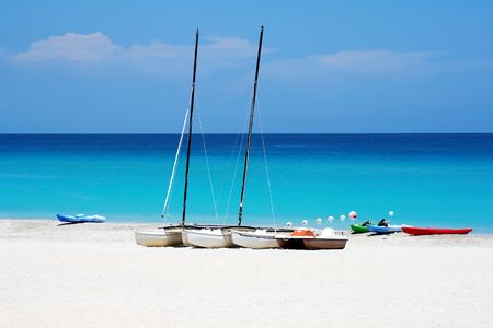 Kayaks and sailing boats on the beautiful beach of Varadero in Cuba image taken from the sea
