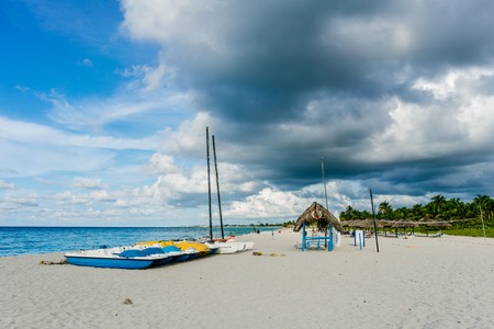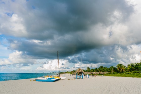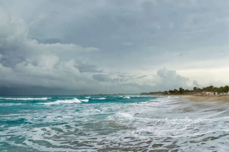 Abandoned beach on Varadero in bad weather, dark clouds over the turquoise sea.