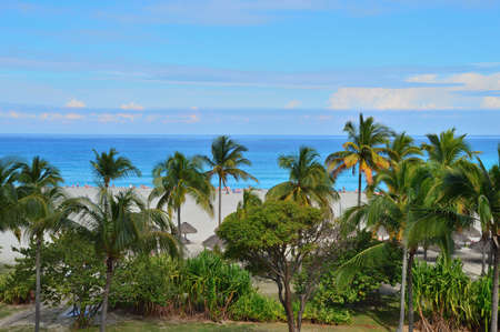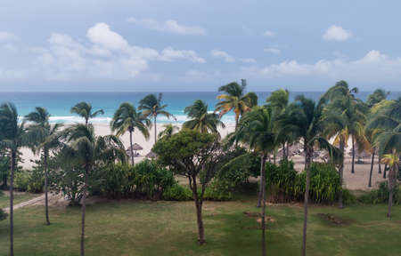 The most beautiful species in the Atlantic Ocean and beach with umbrellas in the resort of Varadero, Cuba