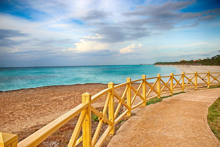 Promenade around the sea with a wooden railing and a view of the water. The clear turquoise sea of the Atlantic ocean on which are white waves. Above it is the blue sky. It's in the Caribbean in Cuba.