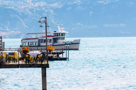 Menaggio, Lombardy, Italy - MAY 11, 2019: View of the famous Menaggio town and the ship on Como Lake, in the Alps before the storm, in inclement weather.