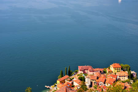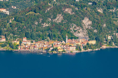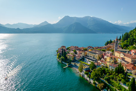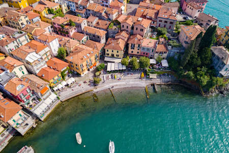 Beautiful aerial waterfront cityscape of Varenna, one of the most picturesque towns on the shore of Lake Como. Charming location with typical Italian atmosphere. Varenna, Lombardy, Italy.