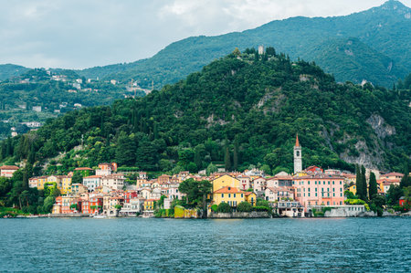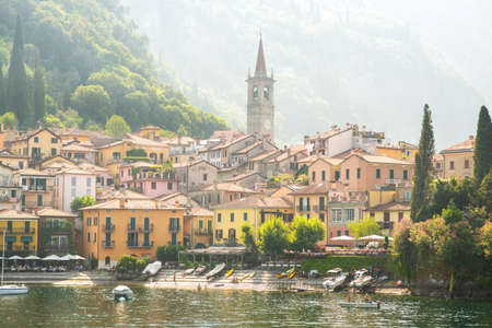 Spectacular view of Italian city of Varenna at foot of mountain on shore of Lake Como overlooking bell tower of Church of San Giorgio, Lombardy