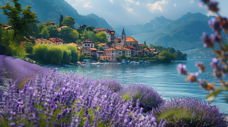 Lavender village on Lake Como, Italy. Lavender flowers blooming on the lake.