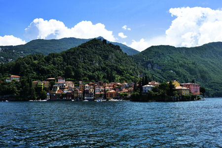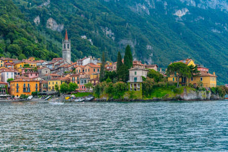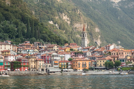 Beautiful Varenna waterfront on a sunny summer afternoon shoot from the water, Lake Como, Lombardy, Italy