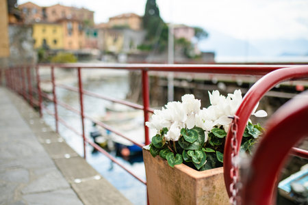 White anemones blossoming in flower pots in Varenna, one of the most picturesque towns on the shore of Lake Como. Charming location with typical Italian atmosphere. Varenna, Lombardy, Italy.