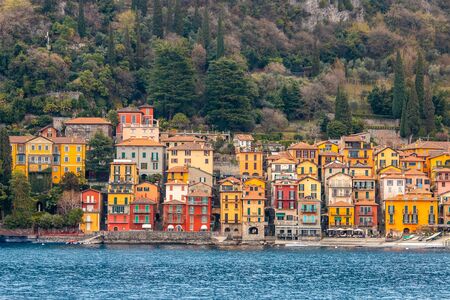 Varenna, Italy. Picturesque town at lake Como. Colourful motley Mediterranean houses at stone beach coastline among green trees.