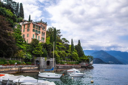 Flowery garden on the lake shore and stunning view with colorful buildings. Moored boats and motorboats in the bay, lake Como, Varenna, Italy, Europe