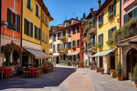 Bellagio, Italy - October 7, 2017: Tourists on narrow street with colorful houses in small town of Bellagio, Italy during sunny day. Como Lake