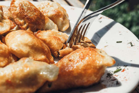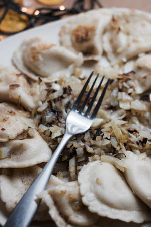 Ukrainian national dish varenyky with cabbage. Shallow dof.