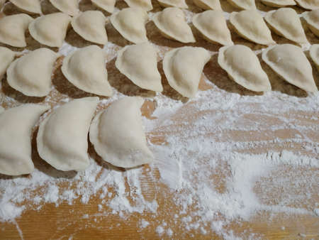 Traditional rustic Russian fresh handmade dumplings lying on the wooden table on the cutting board
