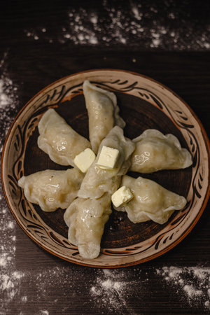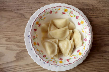 Dumplings, filled with mashed potatoes. Russian, Ukrainian or Polish dish: varenyky, vareniki, pierogi, pyrohy.