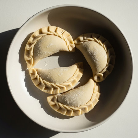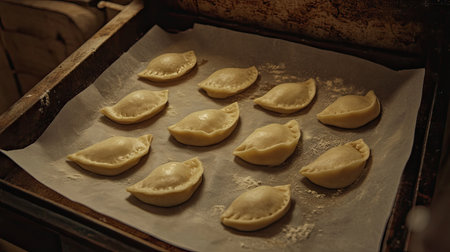 A beautiful arrangement of freshly made dumplings on a baking tray, dusted with flour, evokes a warm, rustic kitchen atmosphere.