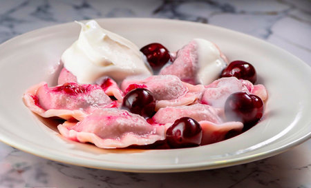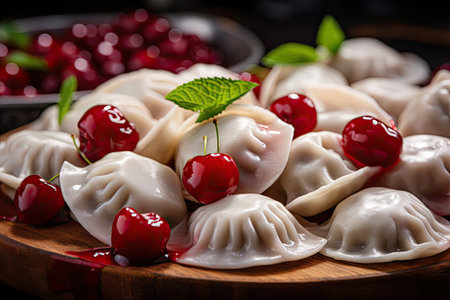 Dumplings with Cherries, Traditional Cherry Pierogi, Sweet Strawberry Vareniki, Fruit Ravioli, Sweet Stuffed Pelmeni, Street Food in Eastern Europe, Generative AI Illustration