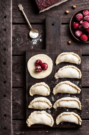 The raw traditional Ukrainian hand-made vareniki (dumpling) with cherry inside