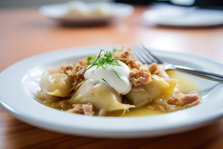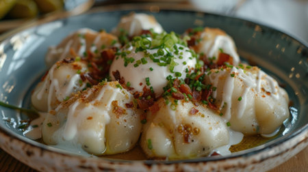 Delicious plate of pelmeni, russian dumplings filled with minced meat, topped with sour cream and parsley, served in a restaurant setting