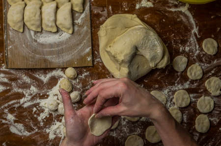 The hands of a woman cook cooked on a table of flour dough and make vareniki