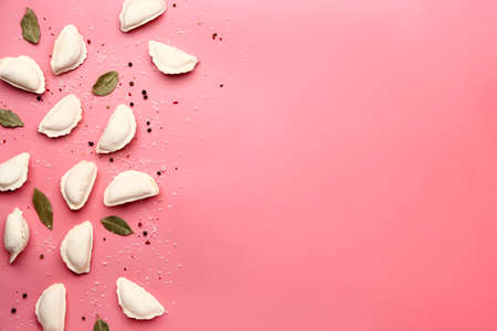 Homemade meat dumplings, russian pelmeni. Top view, copy space.