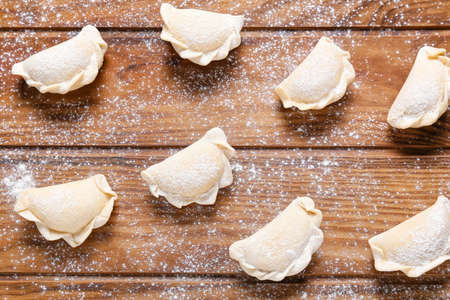 Homemade dumplings, vareniki on an old wooden table, sprinkled with flour, space for text