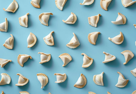 A flat lay of dumplings arranged neatly on a light blue surface, showcasing their unique shapes and textures