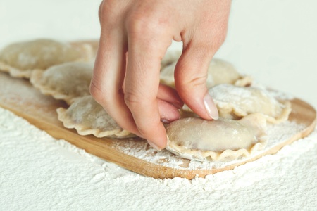Raw dumplings or vareniks, traditional Russian and Ukrainian food, close up
