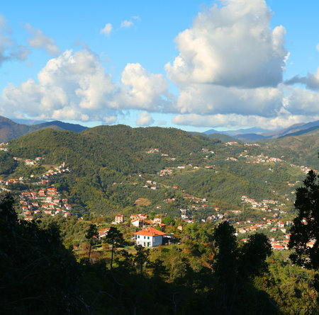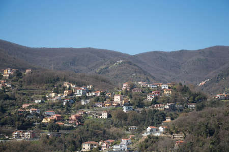 The view of villages houses in the mountains, La Spezia, Liguria, Italy.