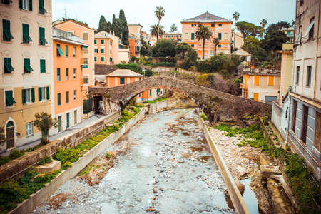 Panoramic view of Bogliasco, ancient seaside village near Genoa, Liguria, Italy. Old buildings and bridge