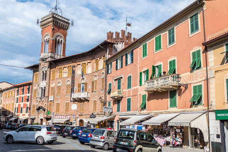Finale Ligure (SV), ITALY - August 24, 2017: Piazza Vittorio Emanuele II in Finale Ligure ITALY. On the square there are several palaces with seventeenth-century facades and the imposing arch dedicated to Margherita Teresa of Spain. The square is also the