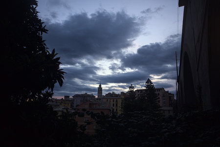 Long time exposure of San Bartolomeo al Mare town at dusk, viewed from above