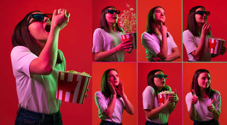 Collage of young, beautiful, emotive girl wearing 3D movie glasses and eating popcorn from colorful basket isolated over red background