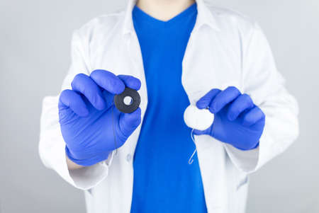 Dental floss close up. Dentist shows how to use the thread correctly. Different types of flossing. The concept of proper oral care. selective focus.