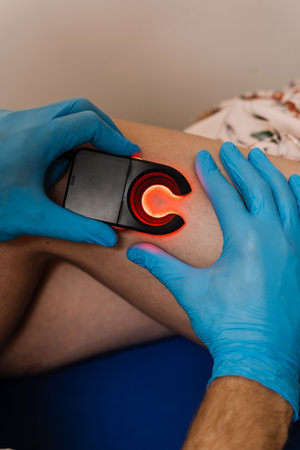 The vascular surgeon examines the outer thigh where the varicose veins are present. Preparation for laser treatment and sclerotherapy. The concept of treating varicose veins at an early stage.