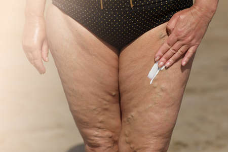 overweight woman applying sunscreen lotion on her legs with varicose veins, close up detail. vacation on sea beach