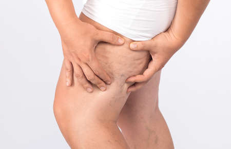 Woman sitting on bed and shows her slim legs with varicosity, venous mesh, rosacea. Close up of female hip. Concept of laser epilation and varicose veins
