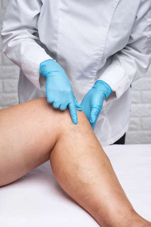 doctor shows the dilation of small blood vessels of the skin on the leg. Medical inspection and treatment of Telangiectasia. Phlebeurysm.
